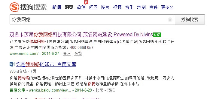 茂名市茂港你我網(wǎng)絡(luò)科技有限公司通過了搜狗官網(wǎng)認(rèn)證點(diǎn)擊查看